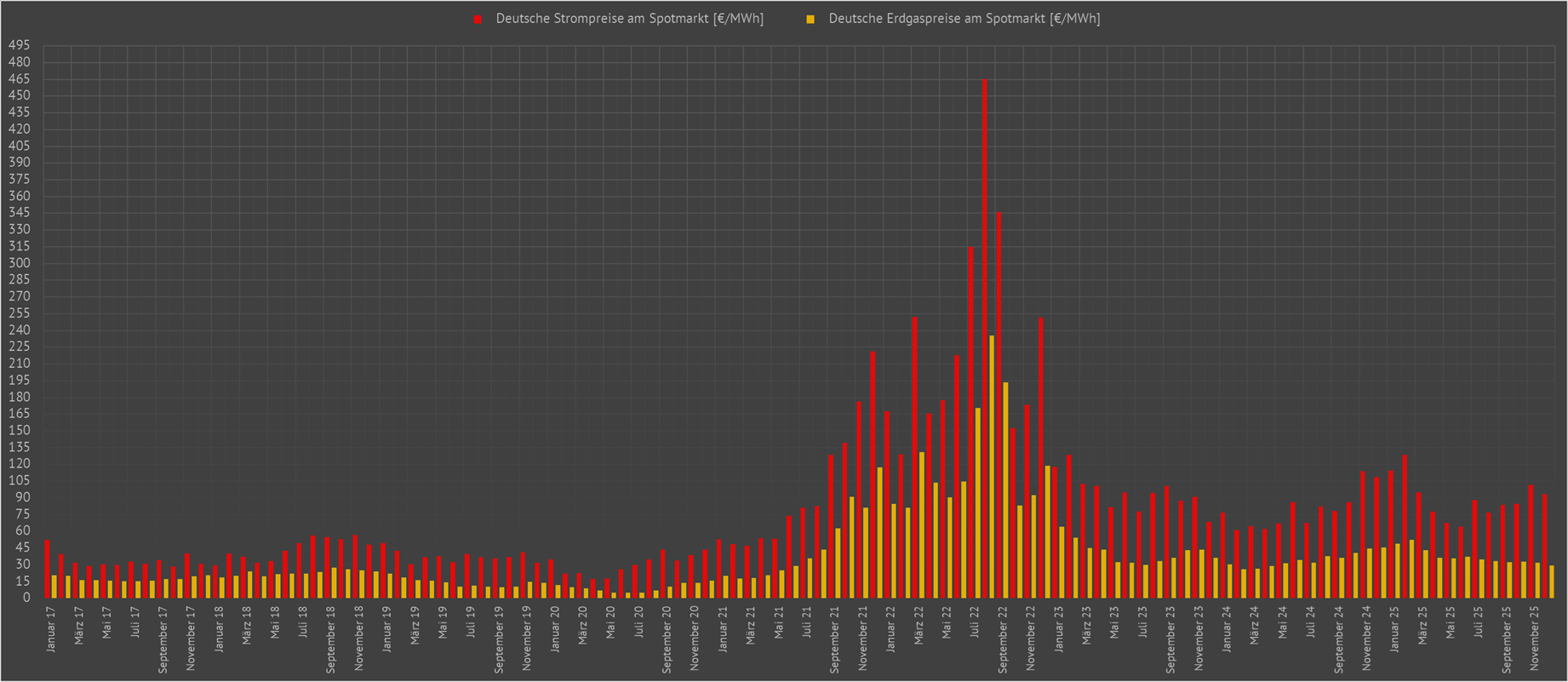 | Dargestellt sind die monatlichen Vergütungen in ct pro kWh für die einspeisenden Wind- und Solarkraftwerke in Deutschland. Deutlich sind die exorbitant hohen Einspeisevergütungen des Jahres 2022 zu erkennen. Diese hohen Vergütungen gingen mit den sogenannten "Übergewinnen" für die Betreiber von Wind- und Solarkraftwerken einher. | ||||||||||||||||||||||||||||||||||||||||||||||||||||||||||||||||||||