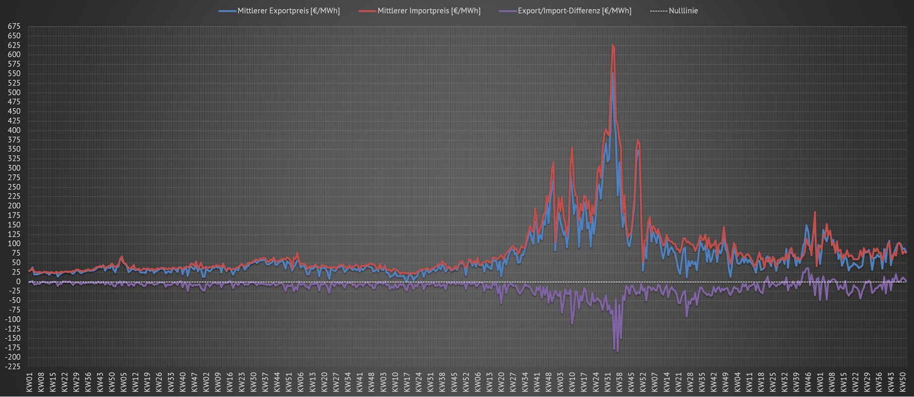 2022 bei 627,28 €. Das entpricht einem Kilowattstundenpreis von 62,728 ct. Die gelbe Linie zeigt den Differenzpreis zwischen dem erzielten Exportpreis und dem gezahlten Importpreis an. Eine hohe negative Differenz bedeutet, dass Deutschland in dieser Kalenderwoche für seine Stromexporte nur geringe Erlöse erzielt hat, dafür aber gleichzeitig hohe Preise für seine Stromimporte zahlen mußte. Generell liegen die Exporterlöse stets unter den Importzahlungen. |
