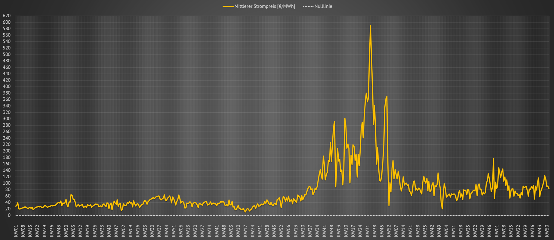 | Der Preis von einem €/MWh geteilt durch zehn ergibt den Preis von einem ct/kWh. Somit lag der im dargestellten Zeitraum aufgerufene Höchstwert für eine Megawattstunde Großhandelsstrom (netto) in der Kalenderwoche 34 im Jahr 2022 bei 589,92 €. Das entpricht einem Kilowattstundenpreis von 58,992 ct. | ||||||||||||||||||||||||||||||||||||||||||||||||||||||||||||||||||||