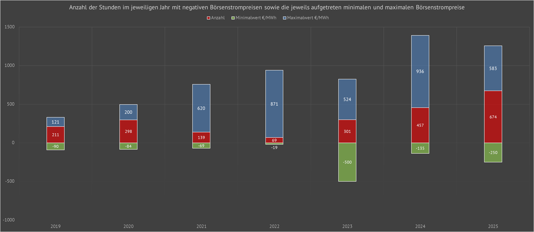 | Im Jahr 2024 wurden an 457 Stunden Börsenstrompreise mit negativen Werten gehandelt. Dabei betrug der gehandelte maximale negative Börsenstrompreis -135 € pro einer gehandelten Megawattstunde Strom. | ||||||||||||||||||||||||||||||||||||||||||||||||||||||||||||||||||||