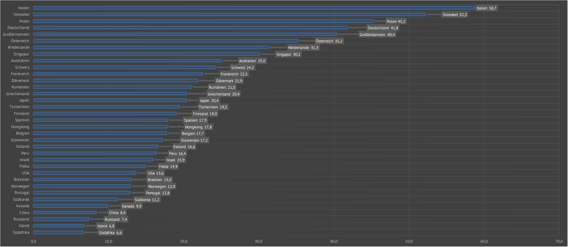 | In Deutschland ist der Strompreis für private Haushalte aktuell mit durchschnittlich 31,8 ct je verbrauchter kWh weltweit unter den G20-Staaten am höchsten. Bezogen auf den durchschnittlichen Strompreis von 13,13 ct/kWh in den G20-Staaten, beträgt davon der durchschnittliche Strompreis in Saudi Arabien lediglich 30 %. | ||||||||||||||||||||||||||||||||||||||||||||||||||||||||||||||||||||