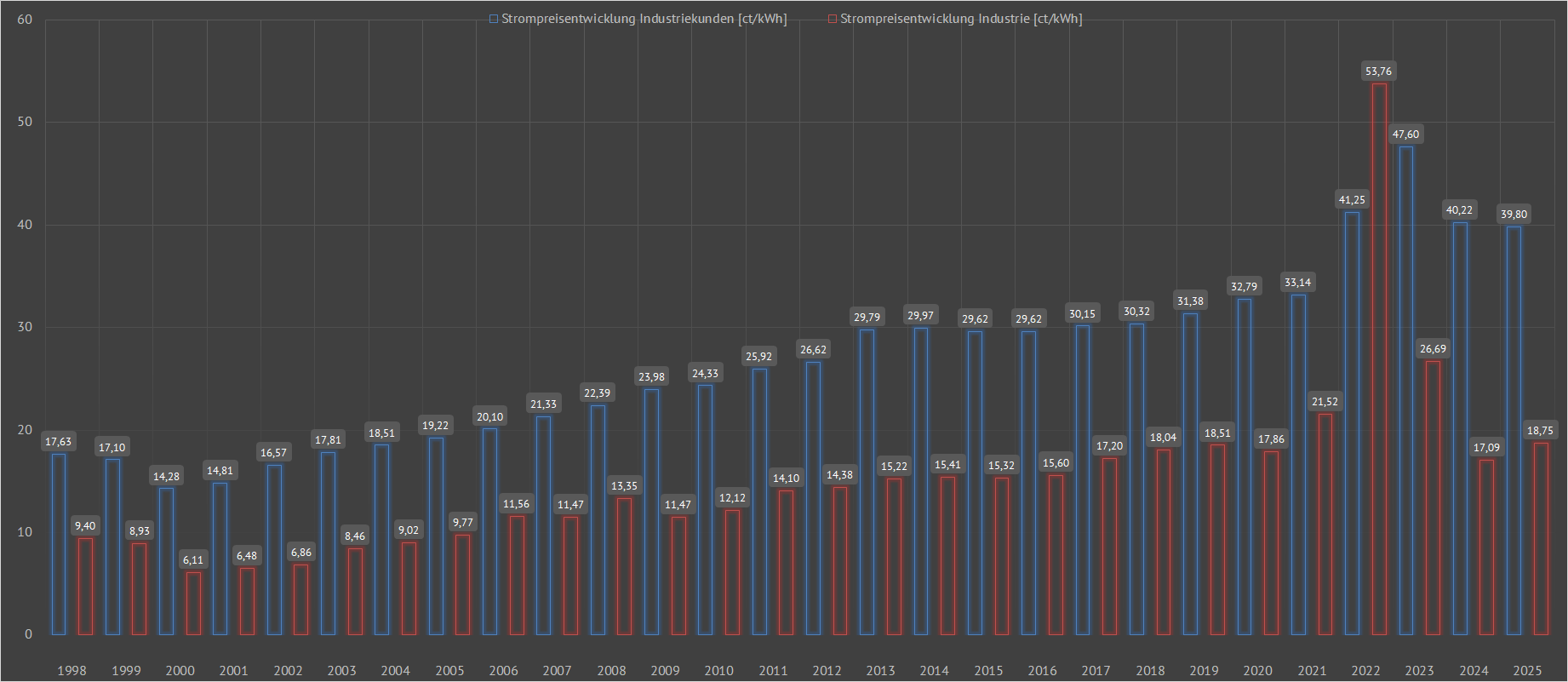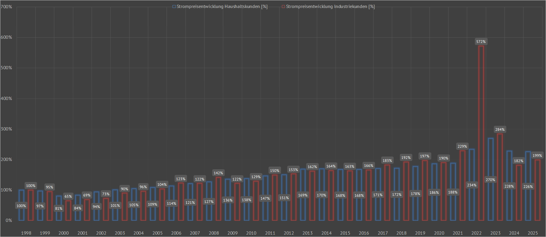 | Darstellung der absoluten [ct/kWh] und der prozentualen [%] Strompreisentwicklung für Haushalts- und Industriekunden in Deutschland | ||||||||||||||||||||||||||||||||||||||||||||||||||||||||||||||||||||