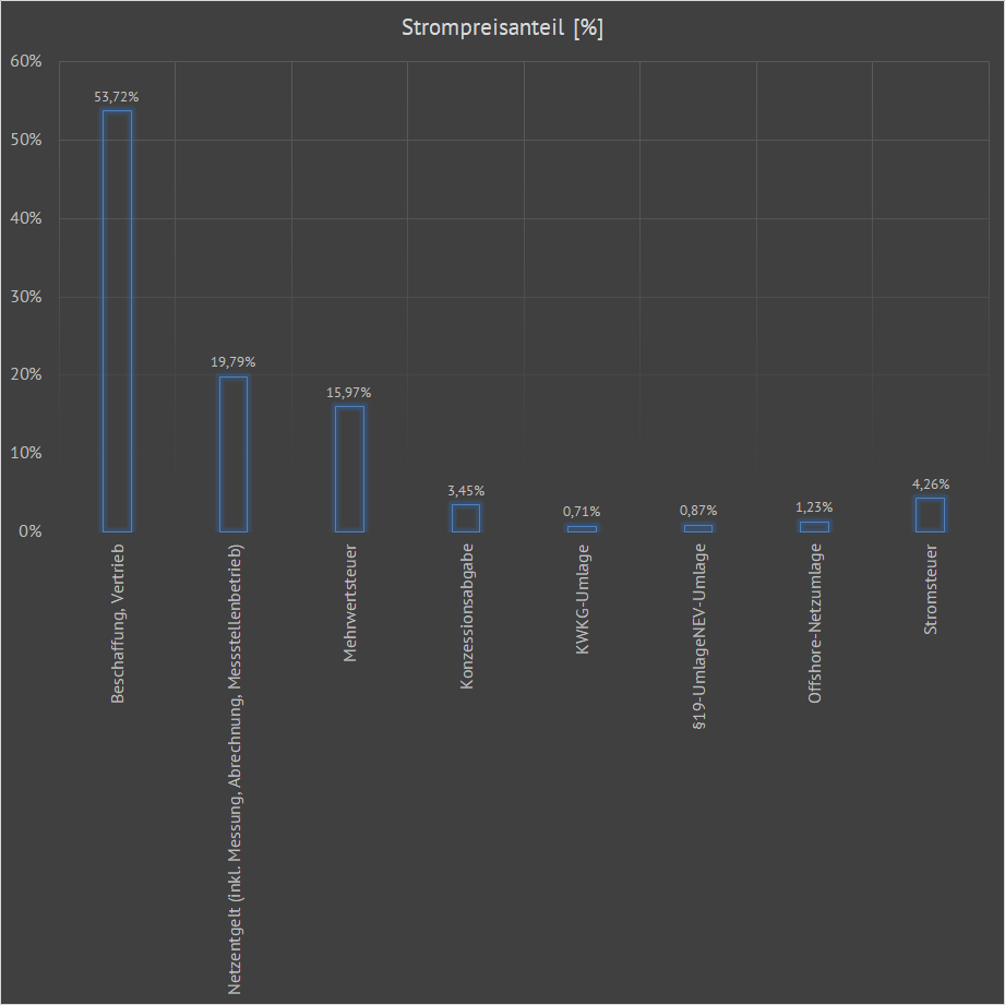 Komponenten zusammen: 1. Reiner Energiepreis plus ggf. Beschaffung, Marketing und Vertrieb 2. Netznutzungsentgelt ohne Messung und Messstellenbetrieb (6,45 ct/kWh Arbeitspreis im Höchstspannungsnetz) 3. Messung und Messstellenbetrieb (Moderne Messeinrichtung 20 €/Jahr, Intelligentes Messsystem verbrauchsabhängig 20 - 120 €/Jahr) 4. Konzessionsabgabe (1,32 ct/kWh bei Gemeinden bis 25000 Einwohner und bis zu 2,39 ct/kWh bei Gemeinden mit über 500000 Einwohner) 5. KWKG-Umlage (Kraft-Wärme-Kopplungsgesetz-Umlage 0,275 ct/kWh) 6. §19 StromNEV-Umlage (individuelle Netzentgeld 0,643 ct/kWh) 7. Offshore-Netzumlage (Kosten aus der Netzanbindung und Entschädigung von Offshore-Windparks 0,656 ct/kWh) 8. Stromsteuer (Förderung klimapolitischer Ziele durch einen sparsameren Umgang mit Elektrizität 2,05 ct/kWh) 9. Umsatzsteuer auf die Positionen 1 bis 7 (19 %) Die Positionen 3 - 9 sind staatlich veranlasste bzw. festgelegte Strompreisbestandteile und können nicht durch den Stromanbieter beeinflußt werden. Die Festlegung der Position 2 (Netznutzungsentgelte) geschieht in der Höhe durch die vier Übertragungsnetzbetreiber und sind durch die Bundesnetzagentur und unabhängige Wirtschaftsprüfer zu überprüfen. Die festgelegte Höhe der Netznutzungsentgelte kann unterjährig aus triftigen Gründen sowohl von den Übertragungsnetzbetreibern als auch von der Bundesnetzagentur angepasst werden. |