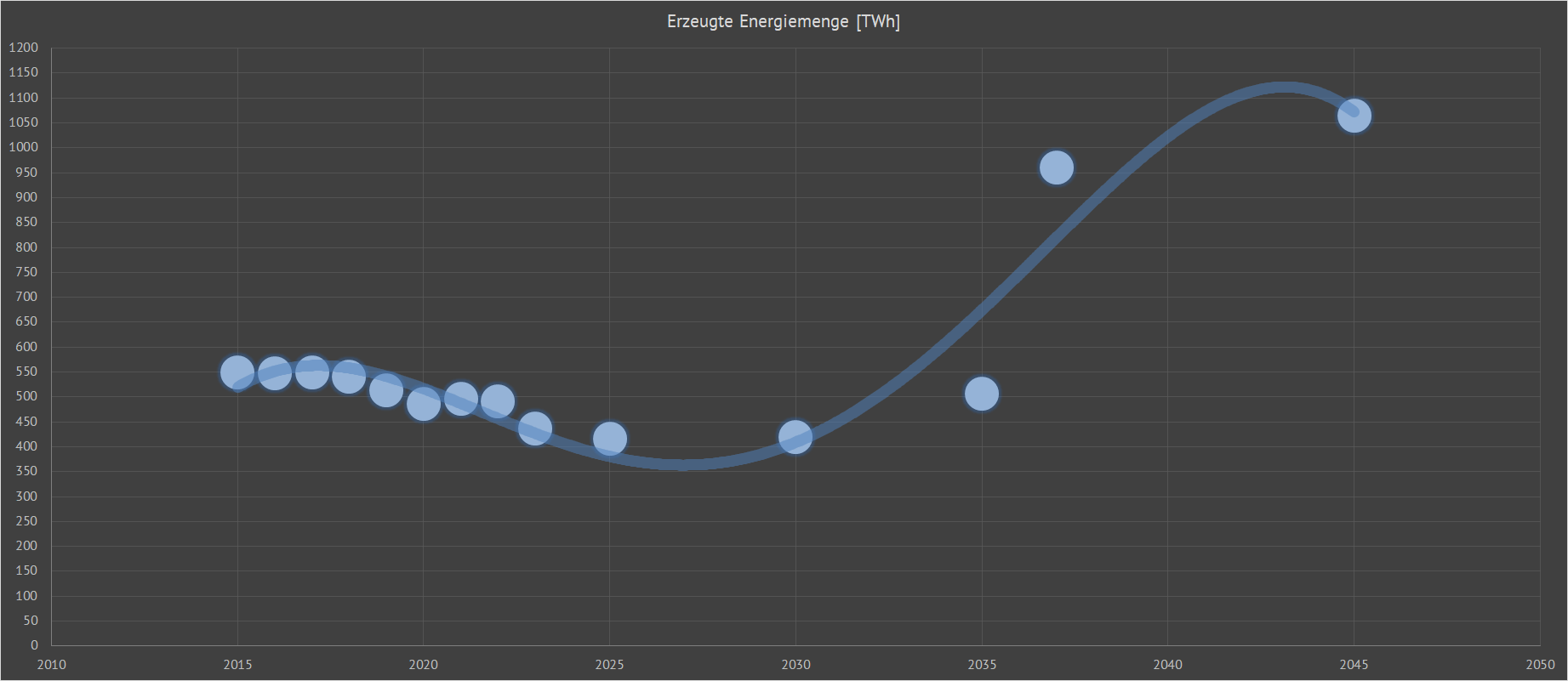 die volatilen Energieträger allein nicht leisten. Um zu verdeutlichen, wie die realen Stromgestehungskosten bei einer 100% kohlenstofffreien Energieversorgung im Jahr 2045 in Deutschland (ohne Importe) aussähen, dient die Studie von Robert Idel. Der Autor berücksichtigt in dieser Analyse nicht nur die Kosten der Stromerzeugung (LCOE), sondern auch die Kosten für die Deckung der Stromnachfrage. Robert Idel geht in seiner Arbeit davon aus, dass ein bestimmter Strommarkt (hier Deutschland im Vergleich zu Texas U.S.) zu 100% entweder ausschließlich durch Biomassekraftwerke, oder durch Kohlekraftwerke, oder durch Gaskraftwerke, oder durch Kernkraftwerke, oder durch Solarkraftwerke oder gemeinsam durch Wind- und Solarkraftwerke betrieben wird. Für diese Szenarien berechnet der Autor die vollständigen Stromgestehungskosten LFSCOE (Levelized Full System Costs of Electricity) in US$/MWh. Er berücksichtigt dabei die Volllaststunden der jeweiligen Kraftwerkstypen, die Volatilität bei der Stromerzeugung der Wind- und Solarkraftwerke und die Kosten für den notwendigen Speicherausbau. Wie auch die LCOE in der obersten Grafik, sind auch die LFSCOE nicht trivial zu berechnen und hängen von vielen Faktoren ab. So z.B. von der Standortwahl des jeweiligen Kraftwerkstyps, von den Erzeugungs- und Nachfragemustern, von den jeweiligen angenommenen Volllaststunden, von den Kosten des Netzausbau (linearer oder exponentieller Kostenanstieg bei der Netzintegration der Kraftwerkstypen) usw. Somit liefern auch die im folgenden dargestellten vollständigen Stromgestehungskosten nur einen unverbindlichen Anhaltspunkt für die Gestehungskosten des deutschen Stromsystems der Zukunft. Laut den genehmigten Netzentwicklungsplänen Strom NEP 2019-2030, NEP 2021-2035 und dem noch zu genehmigen Szenariorahmen NEP 2037-2045 errechnen sich für die ausgewiesenen Jahre 2025, 2030, 2035, 2037 und 2045 für das Szenarium B jeweils folgende Größen: 2025: --> 243,2 GW Erzeugerleistung --> 48 GW Stundenleistung --> 416 TWh erzeugte Energie <-- 565 TWh verbrauchte Energie 2030: --> 275,9 GW Erzeugerleistung --> 48 GW Stundenleistung --> 420 TWh erzeugte Energie <-- 582 TWh verbrauchte Energie 2035: --> 306,7 GW Erzeugerleistung --> 58 GW Stundenleistung --> 507 TWh erzeugte Energie <-- 640 TWh verbrauchte Energie 2037: --> 624,5 GW Erzeugerleistung --> 110 GW Stundenleistung --> 960 TWh --> erzeugte Energie <-- 961 TWh verbrauchte Energie 2045: --> 686,1 GW Erzeugerleistung --> 121 GW Stundenleistung --> 1064 TWh --> erzeugte Energie <-- 1106 TWh verbrauchte Energie Grafisch dargestellt zeigt sich für die (geplante) erzeugte Energiemenge folgender Verlauf: |
