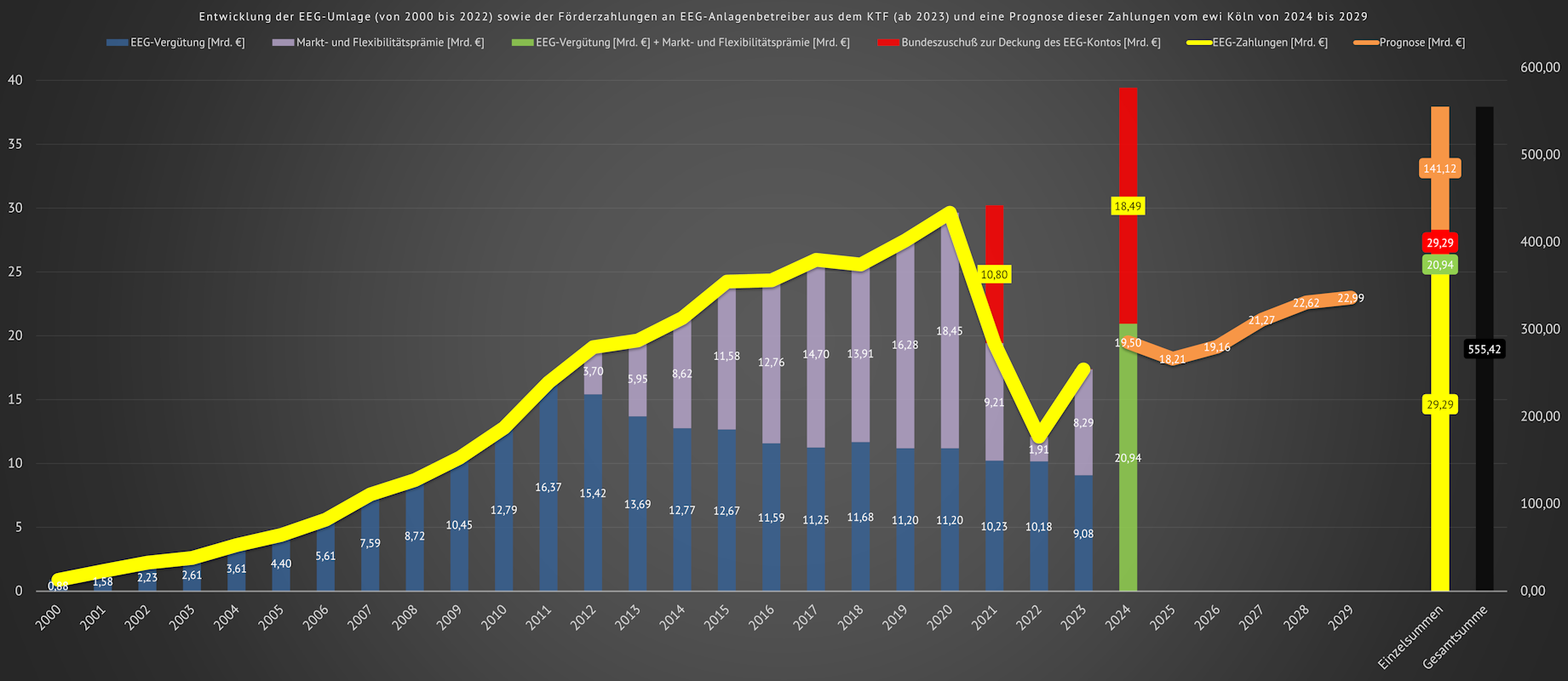 Die prognostizierten Werte ab dem Jahr 2024 basieren auf der Mittelfristprognose des ewi zu Köln. Für das Jahr 2021 schoß der Bund (also der deutsche Steuerzahler) 10,8 Mrd. € zur EEG-Umlage hinzu. Dieser Bundeszuschuß stellte sicher, dass das EEG-Konto für das Jahr 2022 wieder einen positiven Stand aufwies. Die stark gesunkene Markt- und Flexibilitätsprämie im Jahr 2022 gegenüber dem Jahr 2021 ist darauf zurückzuführen, dass im Jahr 2022 die Marktpreise für Strom aufgrund der Energiekrise erheblich gestiegen waren. So lag der durchschnittliche Monatsmarktwert bei Solarstrom im Jahr 2022 bei 22,306 ct/kWh gegenüber einem Monatsmarktwert von 7,552 c7/kWh im Jahr 2021. Diese hohen Marktpreise führten dazu, dass die Marktprämie, die als Differenz zwischen dem anzulegenden Wert und dem Marktwert berechnet wird, signifikant sank. Mit einem sinkenden Monatsmarktwert steigt auch wieder die vom Steuerzahler an die Betreiber von EE-Anlagen zu zahlende Vergütung (Marktprämie).