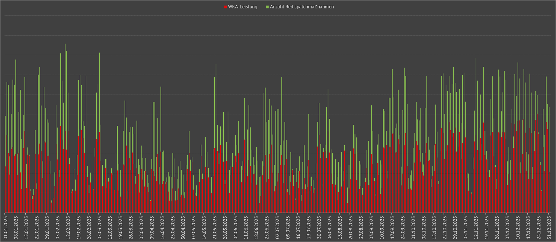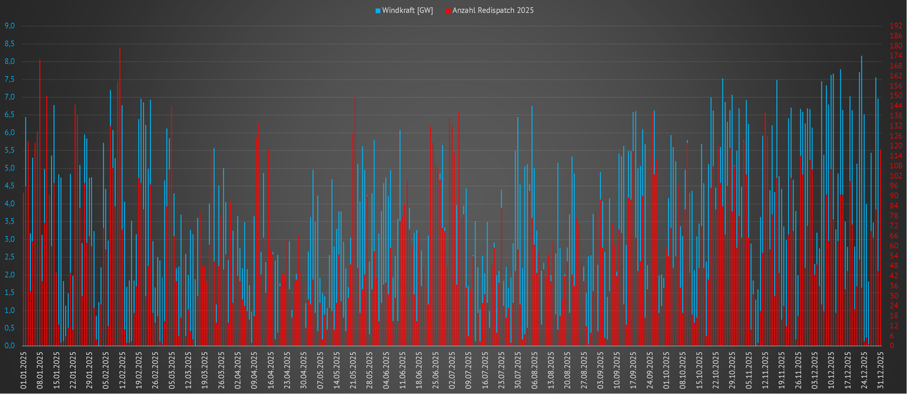 | Monatliche Anzahl der Redispatchmaßnahmen versus eingespeister Windkraftleistung in Deutschland im Jahr 2025 | ||||||||||||||||||||||||