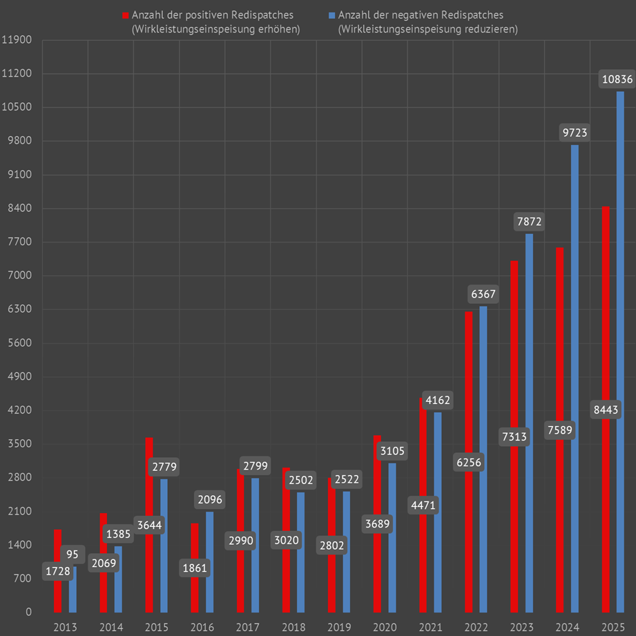 | Anzahl der positiven und der negativen Redispatchmaßnahmen im Jahresvergleich | ||||||||||||||||||||||||