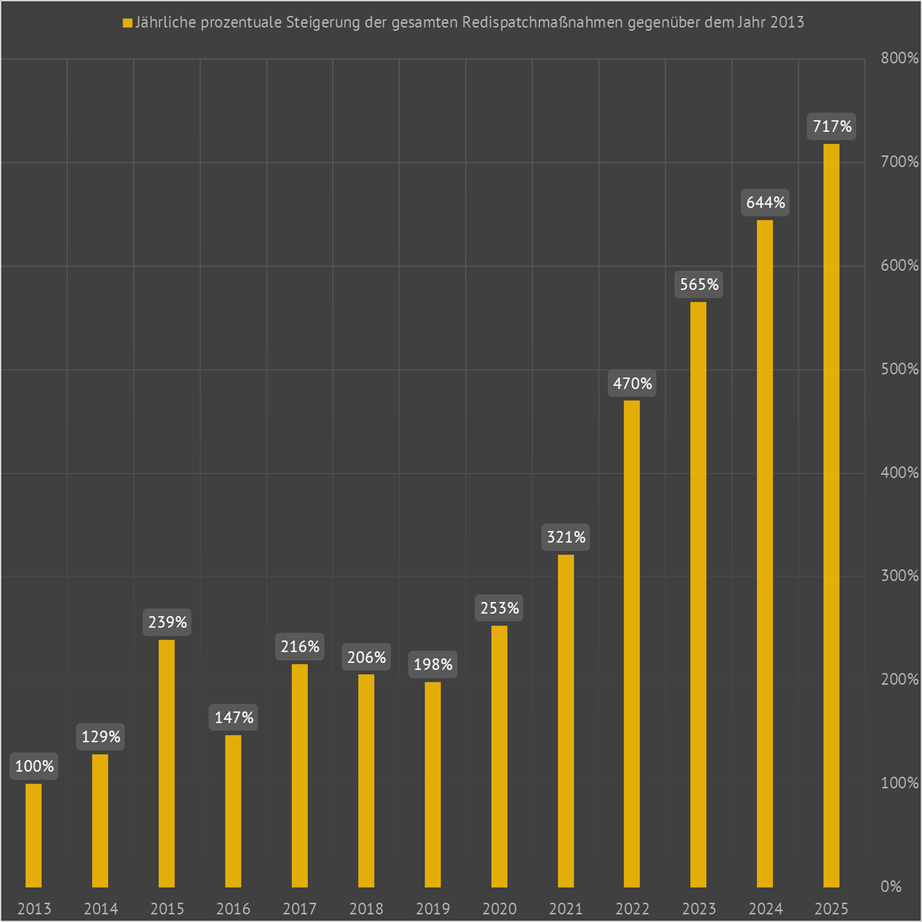 | Dargestellt ist die jährliche Korrelation zwischen Windkraftanlageneinspeisung und den daraus resultierenden Redispatchmaßnahmen. Es ist deutlich zu erkennen, dass die Anzahl an erforderlichen (und preisintensiven) Redispatchmaßnahmen proportional mit der Leistung der einspeisenden Windkraftanlagen zunimmt. Im Umkehrschluß bedeutet das, umso mehr unstetig produzierende Windkraftanlagen in Deutschland einspeisen, desto mehr kostspielige Redispatchmaßnahmen müssen für den Erhalt der Netzstabilität durchgeführt werden. Es ist also zu konstatieren, dass vorwiegend die volatilen Windkraftwerke ursächlich für die erforderlichen Redispatchmaßnahmen sind. | ||||||||||||||||||||||||