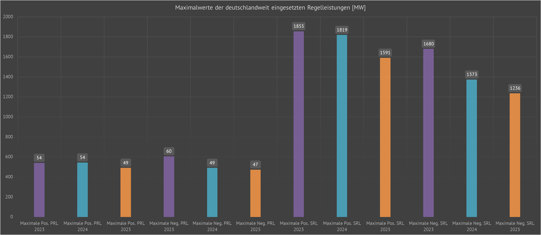 | Dargestellt sind die über das jeweilige Jahr gemittelte eingesetzte positive und negative Primär- und Sekundärregelleistung der Übertragungsnetzbetreiber für das gesamte deutsche Netzgebiet. Weiterhin sind die jeweiligen maximal eingesetzten Leistungen dargestellt. | ||||||||||||||||||||||||