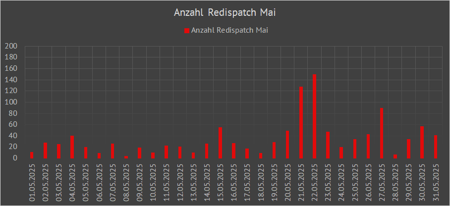 | Dargestellt ist die Anzahl der täglich im aktuellen Jahr von den Übertragungsnetzbetreibern veranlassten Redispatchmaßnahmen für die notwendige Netzstabilität. Es sind die Tage dargestellt, an denen eine Redispatchmaßnahme gestartet wurde. Im Vergleich ist die Anzahl der täglich gestarteten Redispatchmaßnahmen aus dem Jahr 2014 dargestellt. Es ist offensichtlich, dass die Anzahl der Maßnahmen deutlich geringer war. Im Mittel benötigten die Übertragungsnetzbetreiber im Jahr 2014 täglich nur 9 Netzeingriffe, im Jahr 2025 sind es im Mittel täglich 53 Netzeingriffe. | ||||||||||||||||||||||||