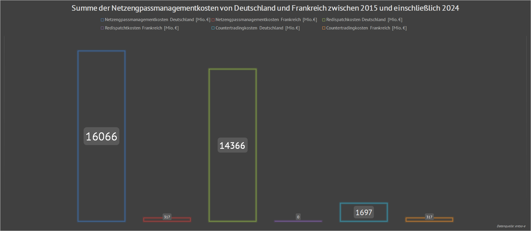 | Dargestellt sind die auffsummierten Kosten für das Netzengpassmanagement (Redispatch + Countertrading) von Deutschland und Frankreich zwischen den Jahren 2015 und einschließlich 2024. Es ist zu erkennen, dass Deutschland in diesem Zeitbereich 50 mal höhere Kosten für das Netzengpassmanagement aufgewendet hat als Frankreich. | ||||||||||||||||||||||||