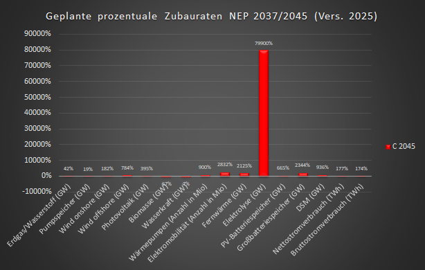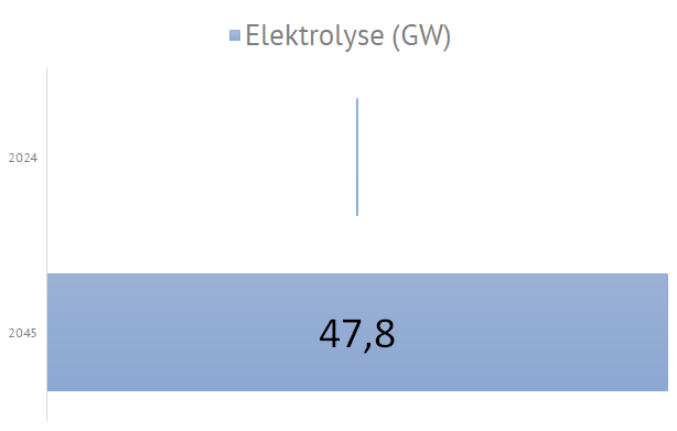 | Die nachfolgende Grafiken geben diesen geplanten Zubau prozentual wieder. Im Szenarium C 2045 muß also innerhalb von 20 Jahren die im September 2024 installierte Elektrolyseurleistung von 0,1 GW auf 80 GW im Jahr 2045 um gigantische 80000 Prozent ausgebaut werden: |