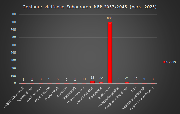 | Die nachfolgende Grafiken geben den geplanten Ausbau als ein Vielfaches vom Iststand September 2024 wieder. Im Szenarium C 2045 muß also innerhalb von 20 Jahren die im September 2024 installierte Elektrolyseurleistung von 0,1 GW auf 80 GW im Jahr 2045 um das 800-fache ausgebaut werden. Die Photovoltaikkraftwerke müssen in ihrer Ausbauleistung verfünffacht werden. Die Anzahl der Elektrofahrzeige muß sich verdreißigfachen, die Anzahl der Wärmepumpen soll sich dann gegenüber September 2024 verzehnfachen: |