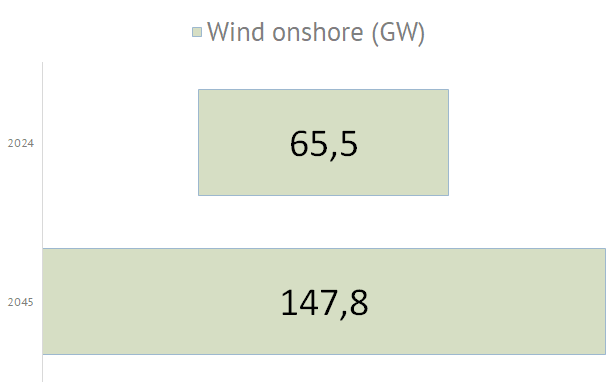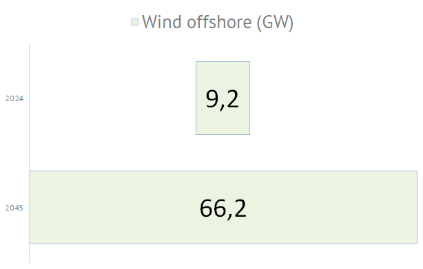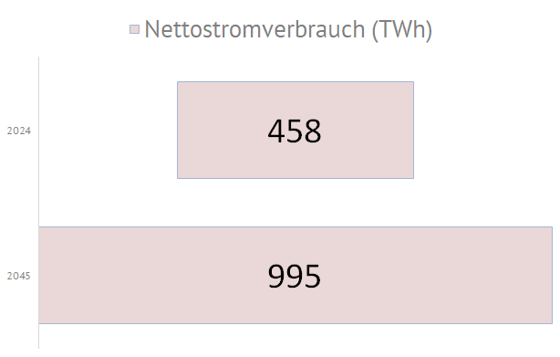 | Die nachfolgende Grafiken zeigen die geplanten Zubauwerte der zukünftigen deutschen Stromversorgung an. Die im September 2024 in Deutschland installierte Elektrolyseurleistung von ca. 0,1 GW soll dann, entsprechend des Szenarios C 2045, bis zum Jahr 2045 um eine Leistung von 80 GW erhöht werden. Die Photovoltaikkraftwerke müssen dann mit einer zusätzlichen Leistung von 408 GW auf 500 GW ausgebaut werden. Die Anzahl der E-Autos soll sich dann von derzeit 1,5 Mio. Fahrzeuge um 43 Mio. Fahrzeuge auf 45 Mio. Elektrofahrzeuge erhöhen. Der Bruttostromverbrauch steigert sich von 494 TWh im Jahr 2023 bis zum Jahr 2045 um 857 TWh auf dann 1351 TWh: |