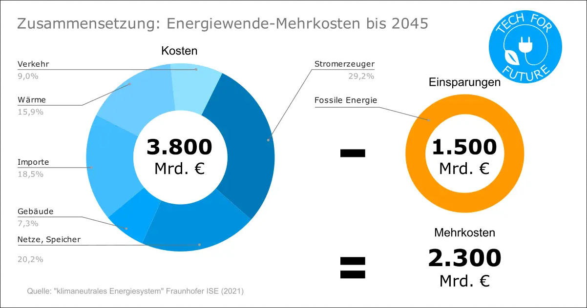 | Der Block Tech-for-Future hat die in dieser ISE-Studie bereitgestellten Zahlen grafisch aufbereitet und kommt mithin zur folgender Kostendarstellung der deutschen Energiewende bis zum "klimaneutralen" Jahr 2045: |