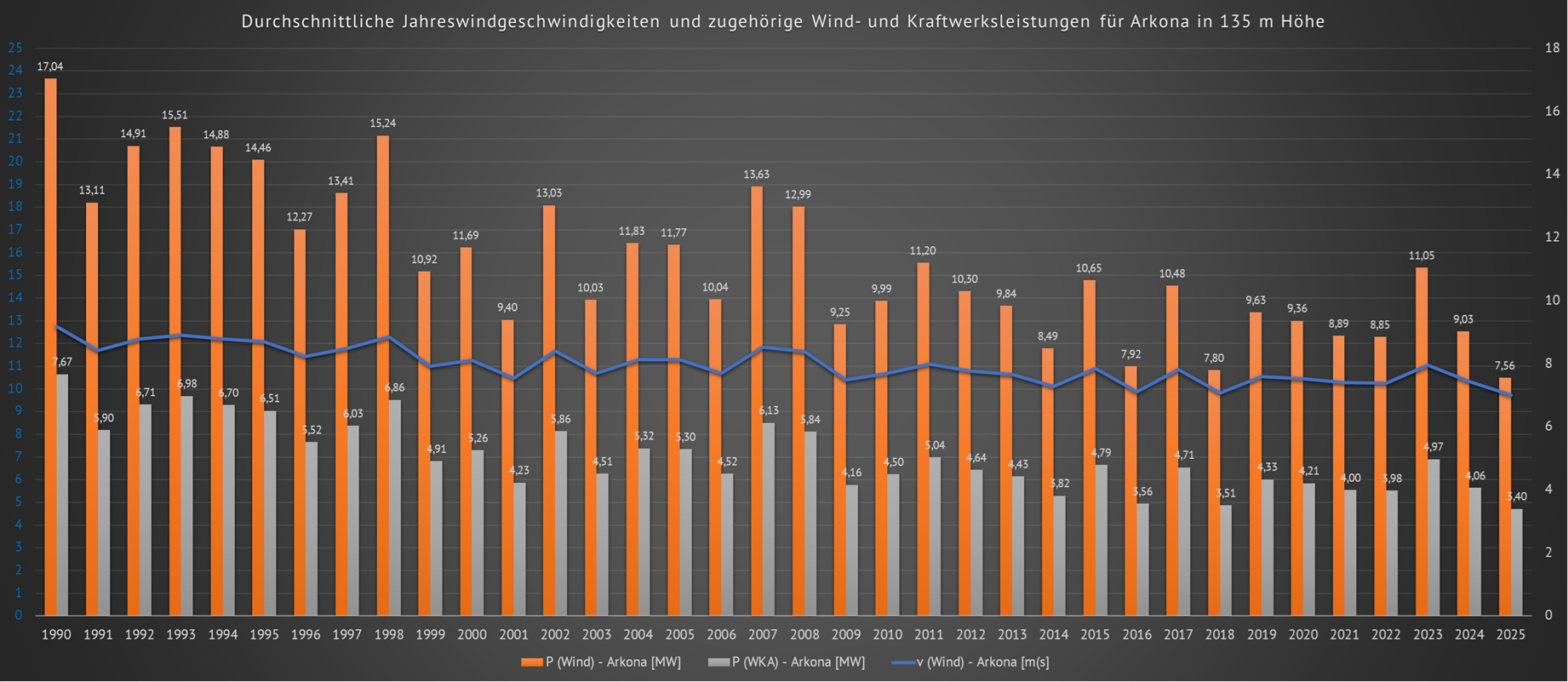 1990 und 2023 gesunken. Auf Grund einer durchschnittlichen Windgeschwindigkeit