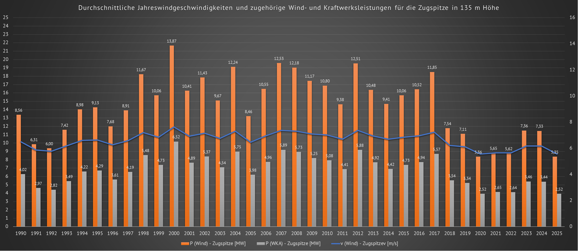 durchschnittliche Windgeschwindigkeit auf der Zugspitze 10,41 m/s. Damit