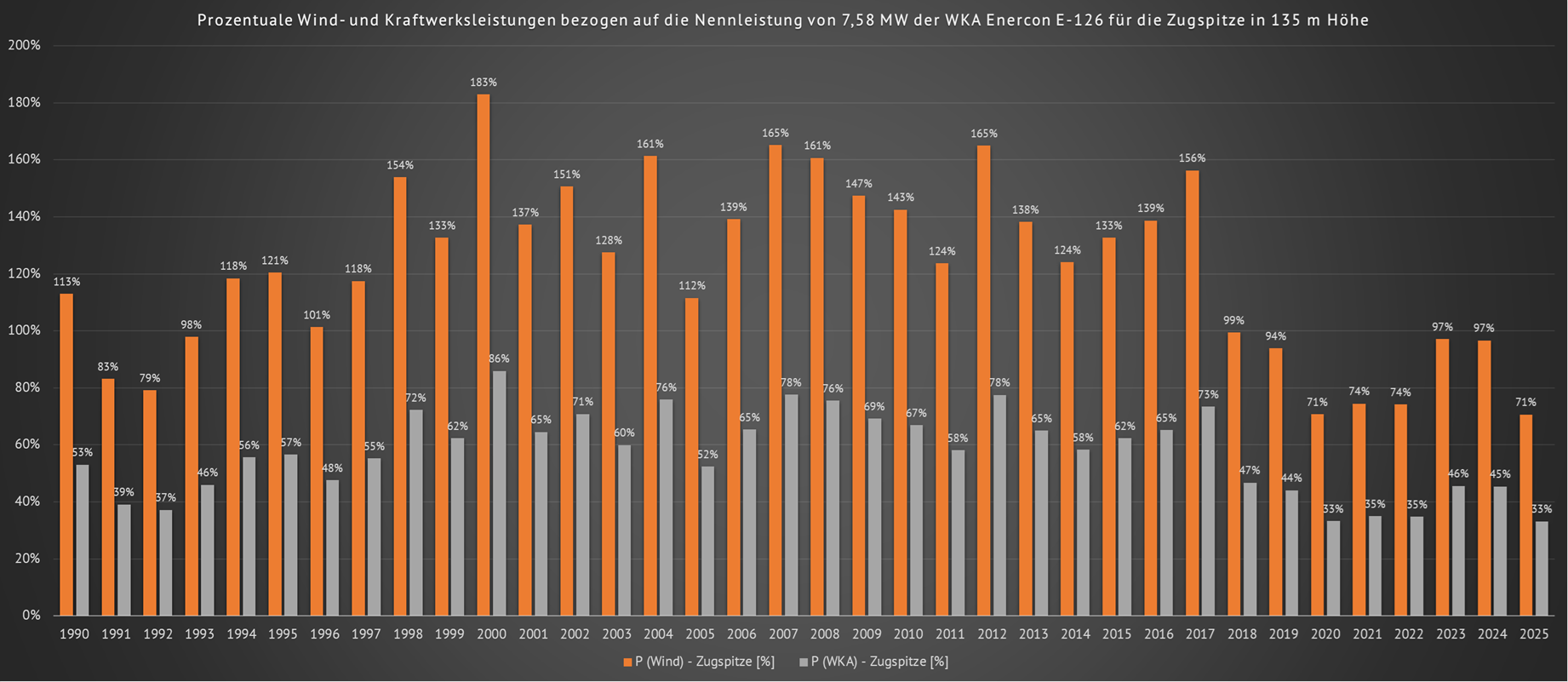 Durchschnitt ausschließlich im mittleren, ab 2017 nur noch im unteren Teillastbereich. Etwaiige Starkwindzeiten mit