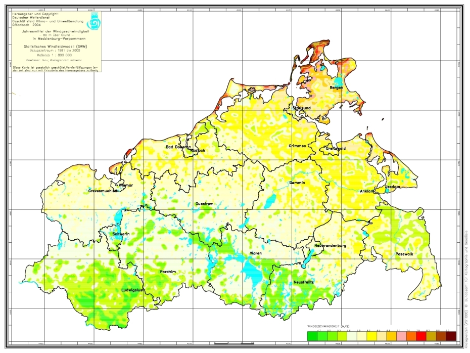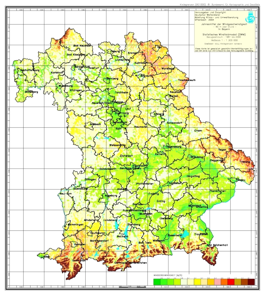 Windgeschwindigkeitsdaten in einer Höhe von 10 m über freiem Gelände