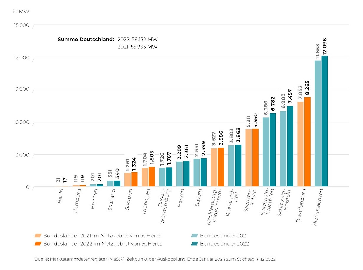| Räumliche Verteilung der installierten Onshore-Windkraftleistung in Deutschland im Jahr 2022 |